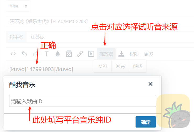 3、音乐试听,发布框上部“播放器”,将对应平台音乐ID填上直接确认即可!优先酷我音乐及网易云音乐ID(非VIP); (酷我)http://www.kuwo.cn/down/single/147991003 要数字ID(尾部全部数字就是歌曲id) (网易)https://music.163.com/#/song?id=2100666406 要数字ID(尾部全部数字就是歌曲id)